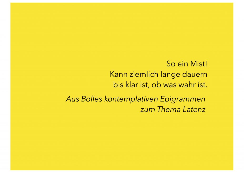 Zugegeben: so richtig weihnachtlich ist auch unser heutiges Türchen nicht. Allerdings meint Bolle, ein bißchen was zum Kontemplieren, zumindest aber doch zum Reflektieren, könne wohl kaum schaden – auch nicht in der Weihnachtszeit.