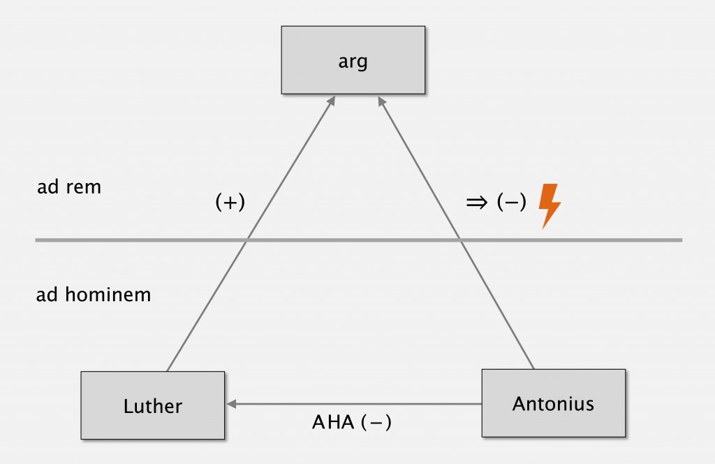 Luther hat ein Argument, egal welches (+). Und nun kommt sein Mitbruder Antonius oder – schlimmer noch – Papst Leo X (1475–1521), ein geborener Medici-Machtmensch, auf die Idee, Luther sei ja wohl ketzerisch – nachgeradezu häretisch also. Zwar hat der Einwand mit Luthers Argument im Kern rein gar nichts zu tun – aber bitteschön. Die dahinterstehende Logik: Weil (!) Luther Häretiker ist, sei folglich (⇒) sein Argument zu verwerfen (–). Allgemeiner, und lutherisch-derb auf den Punkt gebracht: Luther scheiße, also Argument scheiße. Der stilisierte rötliche Blitz soll dabei andeuten, daß das alles mögliche sein mag – nur eben keine Logik in einem wie auch immer gearteten Sinne. Darum wollen wir das auch nicht als Argument gelten lassen. Vielmehr wollen wir von einer Anwandlung sprechen – einem gedanklichen Konstrukt also, das sich nicht mit Luthers Argument auseinandersetzt (ad rem – auf die Sache bezogen), sondern mit Luther als Person an sich (ad hominem). In der Graphik haben wir es dementsprechend auch als Ad-Hominem-Anwandlung bezeichnet, kurz AHA.