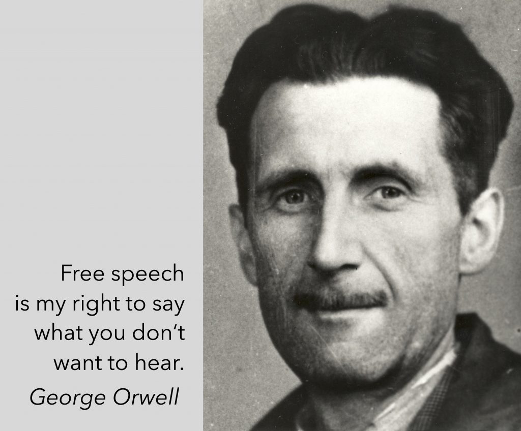 Die Sache ist doch folgende: Wollen wir auf den Wettbewerb der Ideen vertrauen, wie das in den attischen Ekklesien – also den Vollversammlungen all jener, die die Sache was anging – vor 2.500 Jahren schon bewährte Praxis war? Oder wollen wir eine von den Machthabern einmal erkannte Wahrheit einkästeln, konservieren und gegen Anfechtungen aller Art nach Kräften immunisieren? So formuliert, beantwortet sich die Frage von selbst. Ein Wermutstropfen aber bleibt – zumindest aus der Sicht der Mächtigen. George Orwell hat es seinerzeit zeitlos knapp formuliert (siehe unser Schildchen oben):