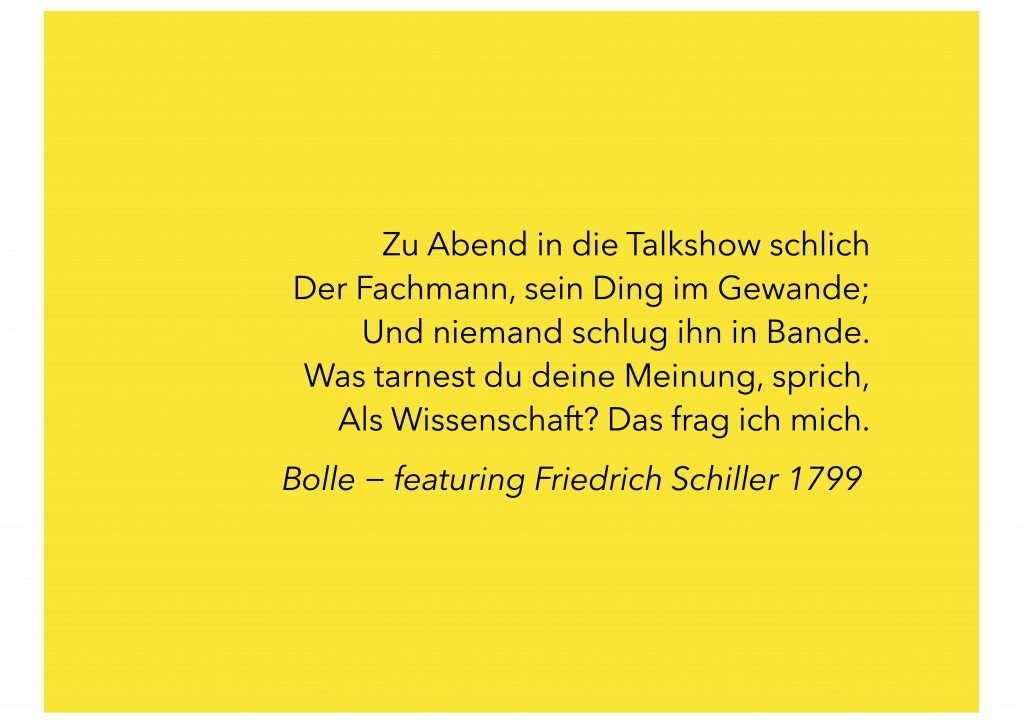 Wahrlich, ich sage Euch: Ich bin Wissenschaftler und als solcher Eins mit der Wahrheit – und im übrigen so unfehlbar wie ansonsten nur der Papst (so das Dogma des Ersten Vatikanischen Konzils 1869–1870). Persönliches Befinden ist mir völlig ferne – da sei Gott vor! Private Meinung sowieso. Kurzum: Da fordert einer – ausgerechnet im Namen der Wissenschaft! – den rechten, orthodoxen Glauben ein. Bolle meint nur: Kaum zu glauben. In Hülsenfrüchtchen-Sprech könnte man hier glatt von einer Verhöhnung der Wissenschaft reden.