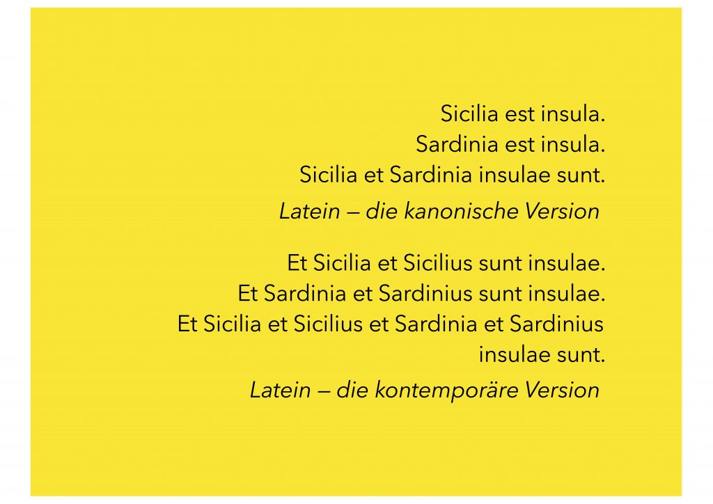 Nun hat sich Bolle die Mühe gemacht, selbiges in eine gendergerechte beziehungsweise nachgerade woke Version zu transformieren. Am Informationsgehalt – der Tatsache nämlich, daß es sich sowohl bei Sizilien als auch bei Sardinien um Inseln handelt – ändert sich dabei nichts, und zwar rein gar nichts. Bolle wollte lediglich korrekterweise berücksichtigt wissen, daß auch die männliche Version gegebenenfalls „mitgedacht“ beziehungsweise mitberücksichtigt sein will. Und so kommen wir auf die alternative Version, die sich in manch jung-modern-aufgeschlossenen Kreisen ja durchaus einer gewissen Beliebtheit erfreuen dürfte – falls man dort überhaupt Latein sprechen würde.